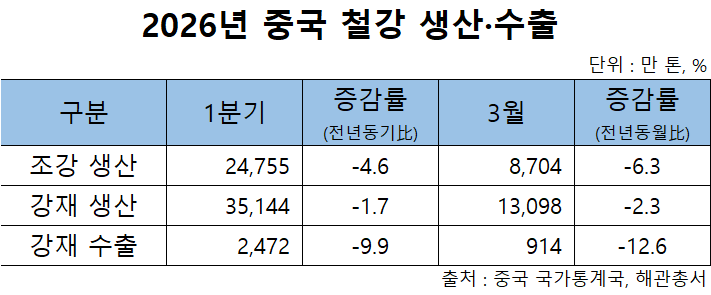 중국 국가통계국(NBS)에 따르면, 2026년 1~3월 중국의 조강 생산은 2억4,755만 톤으로 지난해 같은 기간과 비교해 4.6% 줄었고, 1분기 기준으로 2022년(2억4,338만 톤) 이후 가장 적었다. 3월 생산은 8,704만 톤으로 전년동월대비 6.3% 감소해, 같은 달 기준 2020년(7,898만 톤) 이후 최소치를 기록했다.