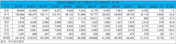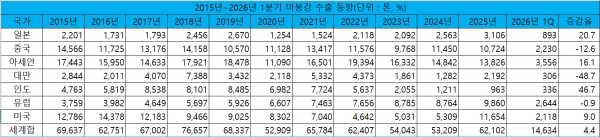 한국철강협회 데이터에 따르면 2026년 1분기 마봉강 수출은 1만4,634톤으로 전년 동기 대비 4.4% 증가했다. 국가별로 중국과 대만, 유럽향 수출은 각 2,230톤, 306톤, 2,644톤으로 전년 대비 12.6%, 48.7%, 0.9% 감소한 반면 일본과 아세안, 인도와 미국향 수출은 각 893톤, 3,556톤, 336톤, 2,118톤으로 전년 동기 대비 20.7%, 16.1%, 46.7%, 9.0% 증가했다.
