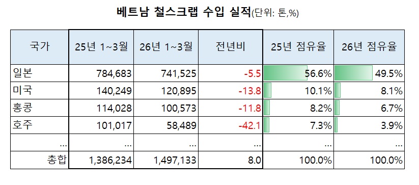 1분기 베트남 철스크랩 수입 8.0% 증가