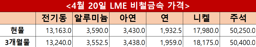 런던금속거래소(LME) 20일(현지시간) 기준 전기동 현물과 3개월물은 각각 톤당 13,163달러와 13,240달러를 기록했으며, 알루미늄은 3,590달러와 3,552.5달러, 아연은 3,430달러와 3,438달러로 집계됐다. 연은 1,932.5달러와 1,959달러, 니켈은 17,980달러와 18,175달러, 주석은 50,250달러와 50,400달러를 나타냈다.