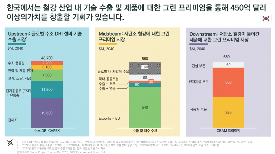 유 총괄은 “한국은 철강산업 내 기술 수출 및 제품에 대한 그린 프리미엄으로 450억 달러 이상의 가치창출 기회가 있는 것으로 평가된다”며 “글로벌 수소 DRI 설비 기술의 수출(업스트림), 저탄소 철강에 대한 그린 프리미엄 시장(미들스트림), 저탄소 철강이 들어간 제품에 대한 그린 프리미엄 시장(다운스트림) 등으로 구분할 수 있다”고 소개했다.