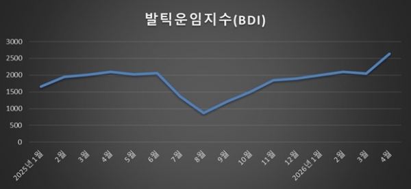 BDI는 지난해 하반기 급락 이후 반등 흐름을 이어왔다. 2025년 7월 1,353에서 8월 864까지 하락한 뒤 9월 1,209로 반등했고, 10월 1,493, 11월 1,850을 거쳐 12월에는 1,900까지 올라섰다. 이후 2026년 1월 2,000, 2월 2,100으로 상승 흐름을 이어갔으며, 4월 들어 2,600선을 넘어서는 수준까지 올라왔다.