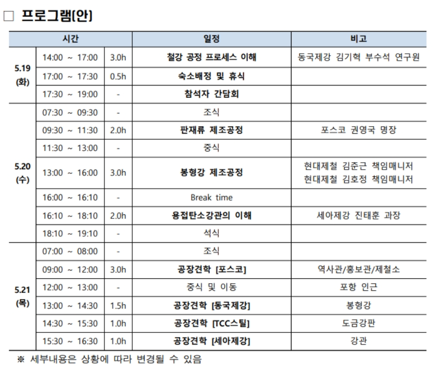 교육 마지막 날에는 포항 지역으로 이동하여 포스코와 동국제강, TCC스틸, 세아제강 등 주요 철강사의 공장 견학이 진행된다. 이번 초급사원 철강연수교육에 대한 문의는 협회 산업기반실 담당자(02-559-3566/jihoe.her@ekosa.or.kr)를 통해 확인할 수 있다.
