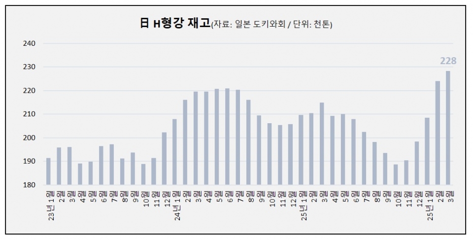한편, 일본제철 H형강 유통사 모임 도키와회(ときわ会)에 따르면 지난 3월 말 전국 유통재고는 22만8,300톤으로 전월 대비 1.9%(4,300톤) 늘면서 5개월 연속 증가했다.