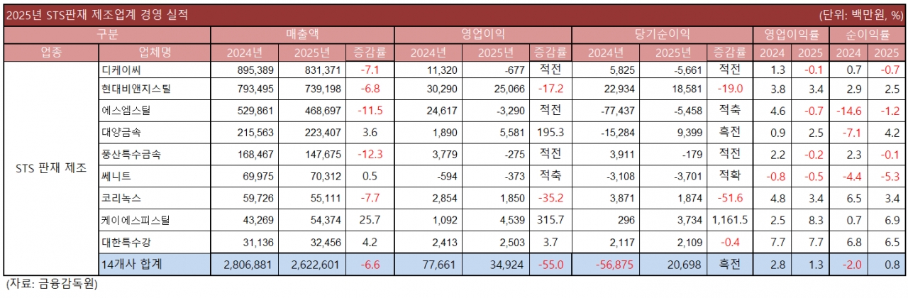 STS판재 제조업, 2025년 영업이익 ‘반토막’…범용재 영업 부진에 수익성 직격탄