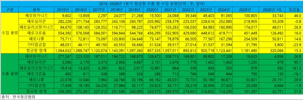 국내 건설 경기 장기 침체와 주요 전방산업 부진에도 반도체를 포함한 일부 산업의 수출 호조, 기저효과 등으로 조강 생산이 소폭 회복됐으나 여전히 신흥국들의 저가 공세가 지속되면서 1분기 합금철 수입이 3년 연속 증가세를 보이고 있다. 반면 합금철 업계의 생산 축소, 중동전쟁과 트럼프 리스크 등에 따른 대외 악재에도 1분기 수출은 2년 만에 반등한 것으로 나타났다.