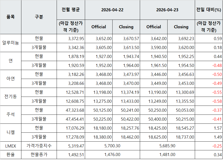[표] LME 비철금속 및 환율 동향(4월 23일)