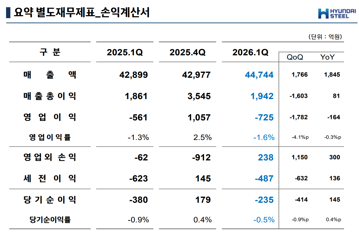 현대제철이 발표한 2026년 1분기 요약 별도재무제표 손익계산서에 따르면, 매출액은 4조 4,744억 원을 기록하며 전분기 대비 1,766억 원(4.1%), 전년 동기 대비 1,845억 원 증가하며 외형 성장에는 성공했다.