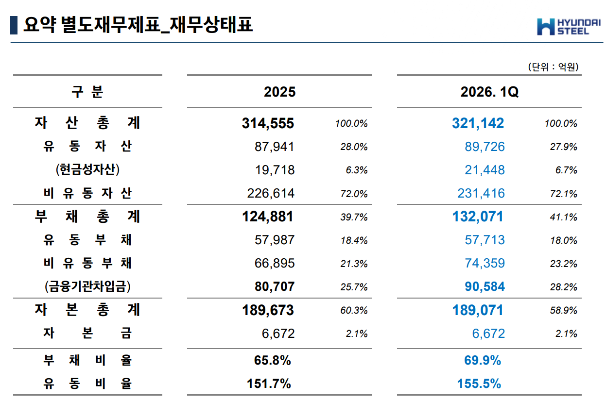 별도 기준 재무 구조에서는 현금성 자산을 늘리며 유동성 확보에 주력하고 상황이 확인됐다. 현대제철의 2026년 1분기 요약 별도재무상태표에 따르면, 자산 총계는 32조 1,142억 원으로 전년 말(31조 4,555억 원) 대비 약 6,587억 원 증가했다. 특히 현금성 자산이 1조 9,718억 원에서 2조 1,448억 원으로 확대되며 전체 자산 내 비중도 6.7%로 상승했다.