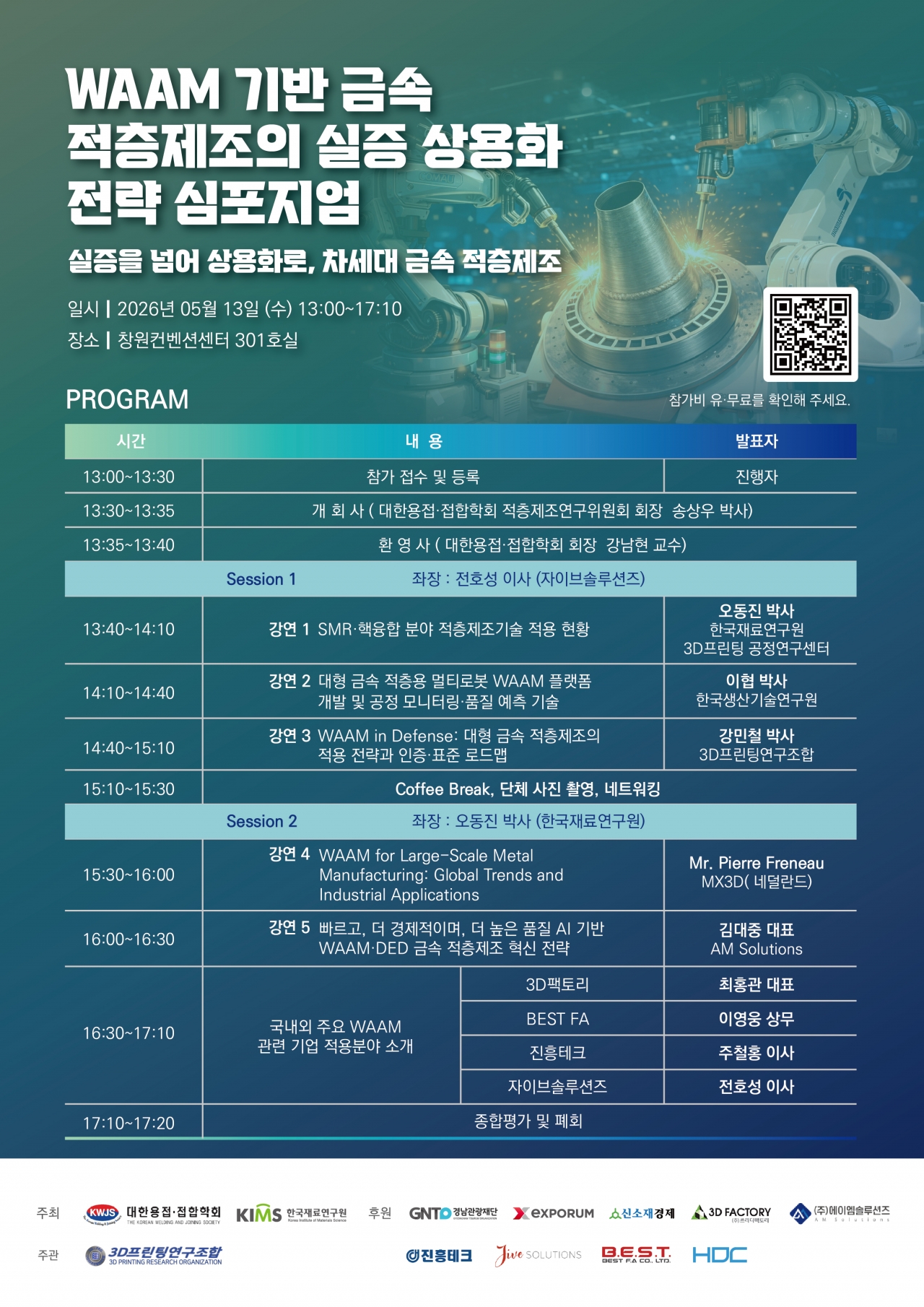 심포지움에는 한국재료연구원, 한국생산기술연구원 등 주요 연구기관과 국내외 기업 전문가들이 참여한다. 1부에서는 SMR·핵융합 분야 적층제조기술 적용 현황, 대형 금속 적층용 멀티로봇 WAAM 플랫폼 개발, 공정 모니터링 및 품질 예측 기술, 방산 분야 대형 금속 적층제조 적용 전략과 인증·표준 로드맵이 발표된다. 2부에서는 글로벌 WAAM 산업 동향과 대형 금속 제조 응용 사례, AI 기반 WAAM·DED 금속 적층제조 혁신 전략, 국내외 주요 WAAM 관련 기업의 적용 분야 소개가 이어진다.