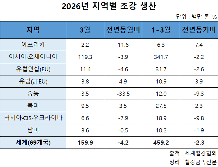 글로벌 조강 생산 감소세가 1분기에도 이어졌다.