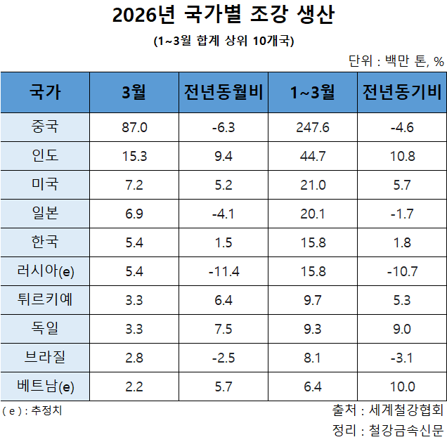 미국의 생산도 1분기 2,100만 톤으로 지난해 같은 분기보다 5.7% 늘었다. 2025년 미국의 생산은 3.1% 증가한 가운데 일본을 제치고 4위에서 3위로 올라섰다.