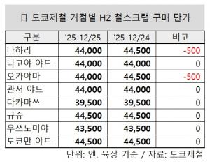 이번 인하로 거점별 철스크랩 가격은 H2 등급 기준 △다하라 4만3,000엔 △나고야 야드 4만2,000엔 △오카야마 4만2,500엔 △관서 야드 4만2,000엔 △다카마쓰 4만500엔 △규슈 4만2,500엔(-500엔) △우쓰노미야 4만1,000엔으로 조정됐다.