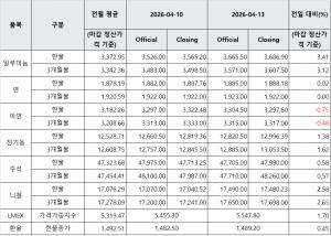 [표] LME 비철금속 및 환율 동향(4월 13일)