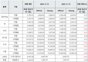[표] LME 비철금속 및 환율 동향(11월 13일)