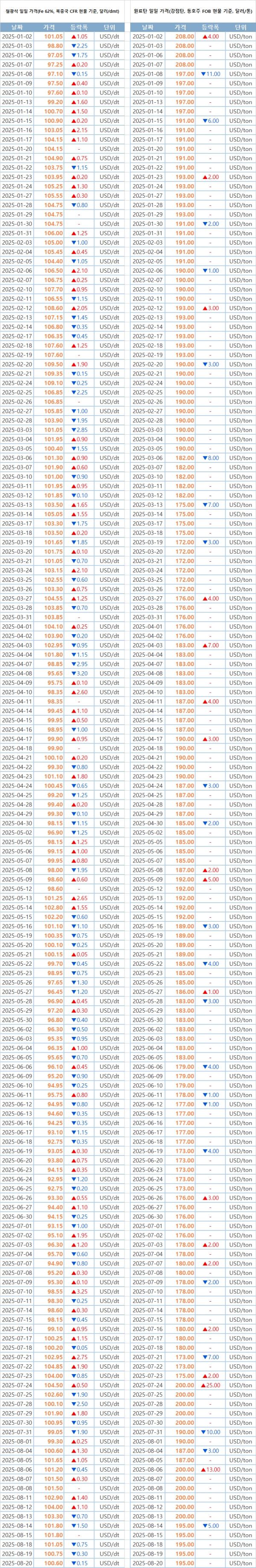 [표] 일일 철강 원료 가격 동향(8월 20일)