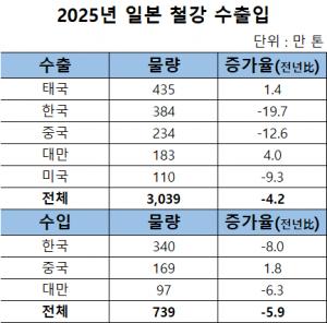 2025년 3,039만 톤, 전년比 4.2%↓한국·중국·미국↓, 태국·대만↑