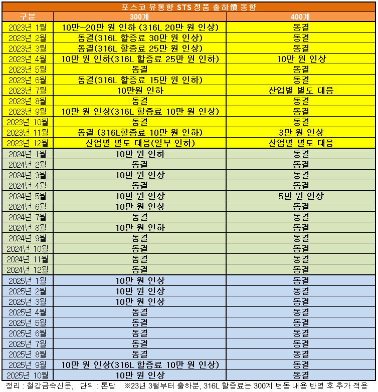 한편, 이번 결정으로 유통향 400계 출하 가격은 17개월 연속 동결됐다. 포스코는 올해 들어 300계만 5차례 인상(총 50만 원)했고 316L 엑스트라 가격은 10월 한 차례만 톤당 10만 원 인상했다.