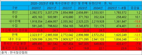 한국철강협회 데이터에 따르면 올해 1~8월 특수강봉강 생산과 수출은 각 178만3,572톤, 25만8,402톤으로 전년 동기 대비 1.2%, 10.1% 증가했다. 반면 내수판매와 전체판매, 내수 수요는 각 136만1,847톤, 162만249톤, 183만6,248톤으로 전년 동기 대비 15.8%, 12.5%, 10.1% 감소했다. 수입은 47만4,401톤으로 전년 동기 대비 8.3% 감소했으나 수입재 점유율은 25.8%로 전년 동기 대비 1.3%p 상승했고, 중국산 수입은 43만3,417톤으로 전년 동기 대비 7.9% 감소했으나 점유율은 23.6%로 전년 동기 대비 1.5%p 상승했다.