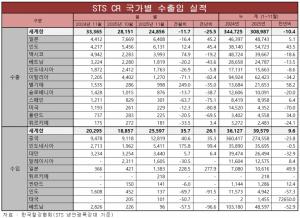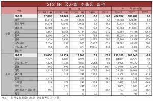 국가별 철근 수출은 1~3분기 싱가포르향이 2만8,000톤으로 최대치를 기록했으며, 이어 미국향이 1만6,000톤으로 뒤를 이었다.