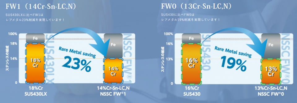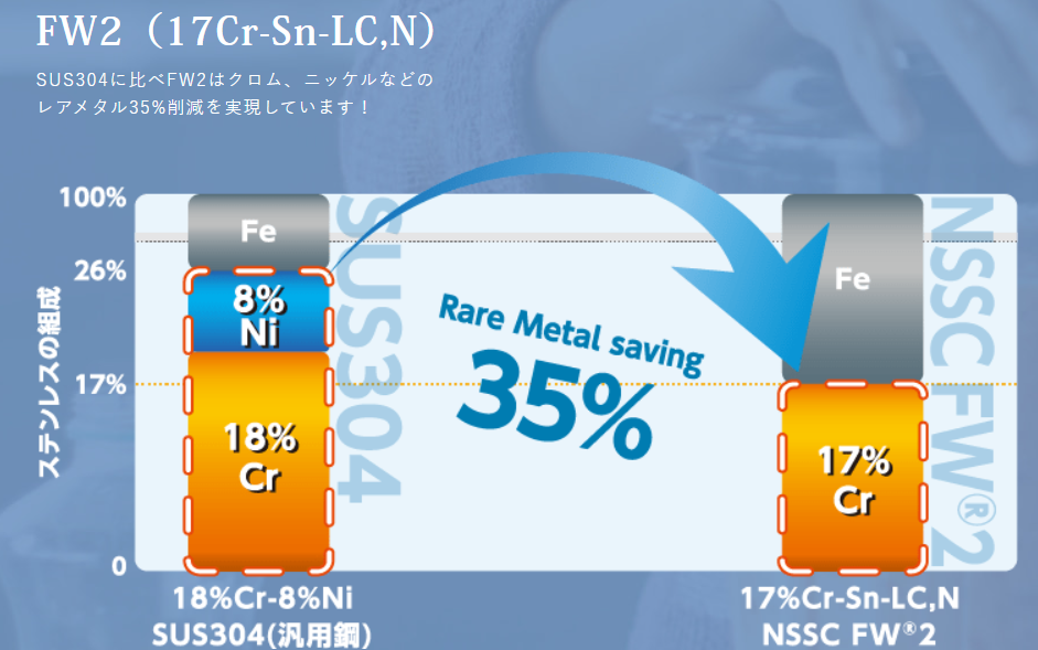 일본제철은 합병 이전 NSSC(올해 일본제철과 합병 완료)가 개발 및 생산·공급한 ‘NSSC FW®2(17Cr-Sn-LC,N강)’이 누계 출하 500톤을 달성했다고 전했다. NSSC FW 시리즈는 일본제철(NSSC)이 독자 개발한 제품으로 세계 최초로 주석(Sn)을 주원료로 하는 고순도 페라이트계 스테인리스강 제품군이다. 현재 일본의 물산업과 주방제품, 세탁기 부품, 냉장고 도어, 싱크볼, 캐비닛, 물탱크, 텀블러 등으로 사용이 확대되고 있는 중이다.