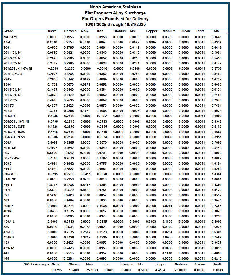 북미 지역 최대 STS밀인 NAS(North American Stainless)는 10월 STS 판재류의 합금 할증료(alloy surcharge)로 STS304(L) 강종을 파운드당 0.8099달러로 산정했다. 전월 대비 0.15% 소폭 인하됐다. 사실상 동결 수준이다.