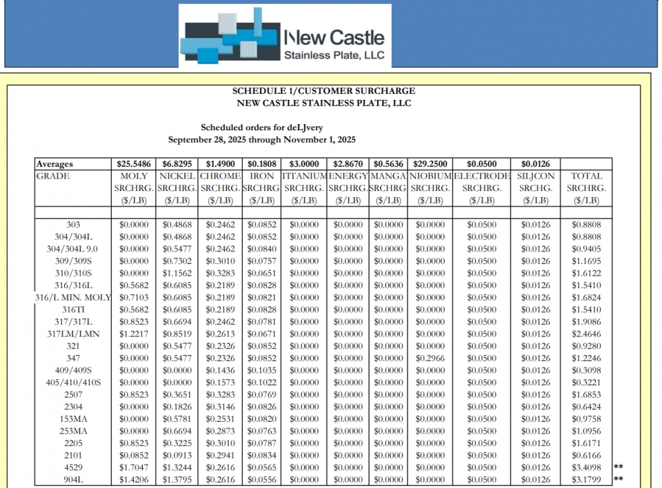 또 다른 지역 주요 STS밀인 뉴캐슬 스테인리스플레이트(New Castle Stainless Plate LLC/과거 오토쿰푸 소속사업장으로 2017년 매각)는 10월 STS304(L) 할증료를 파운드당 0.8808달러로 전월 대비 0.07% 인하했다. 반면, 회사는 몰리브데넘계인 STS316(L) 할증료는 파운드당 1.5410달러로 전월 보다 2.8% 인상했다. 전월에도 316강종 할증료는 2.8% 인상된 바 있다.