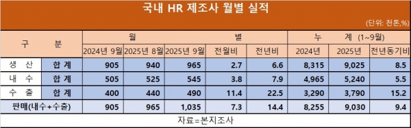 1~9월 누계 기준 생산은 902만5천 톤으로, 지난해 같은 기간보다 8.5% 늘었다.