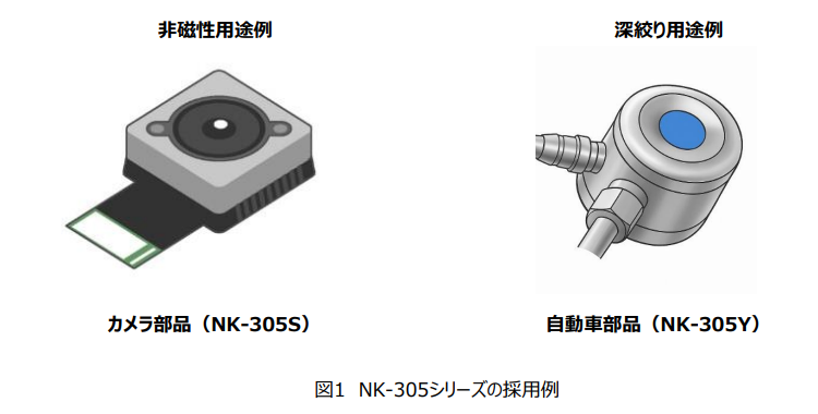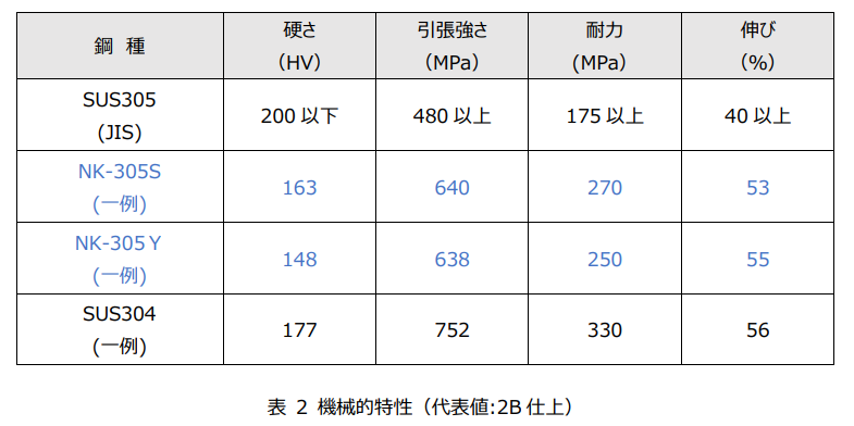 일본금속은 “최근 전자기기의 소형화 및 고밀도화, 그리고 자동차의 경량화 흐름에 따라 이들 산업에서 사용되는 소재는 가공 후에도 자기를 띠기 어려운 비자성과 복잡한 형상으로 가공할 수 있는 성형성이 동시에 요구되고 있다”라며 “기존의 스테인리스강으로는 두 가지 특성을 모두 만족사키기 어려워 새로운 NK-305 시리즈로 최신 수요에 대응하려 한다”고 설명했다.