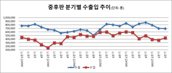 국내 열연강판과 후판 시장이 반덤핑 조치 이후 빠르게 재편되고 있다. 중국과 일본산 제품의 유입이 급감하면서, 국내 제조사 중심의 공급망이 안정화 단계에 접어들었다는 평가가 나온다. 특히 3분기 기준 수출은 늘고 수입은 줄어드는 흐름을 보였다.