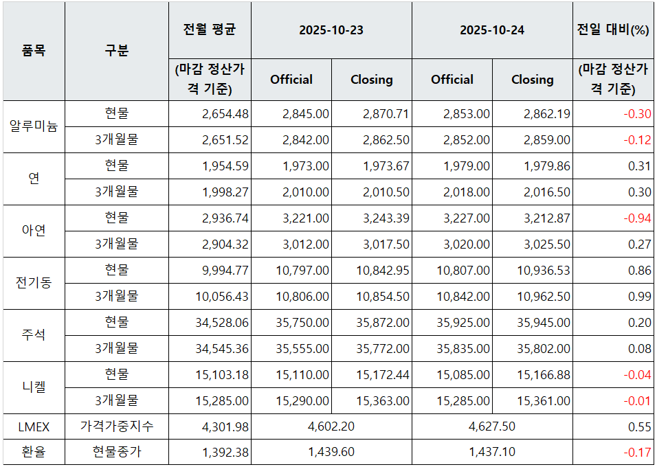 [표] LME 비철금속 및 환율 동향(10월 24일)