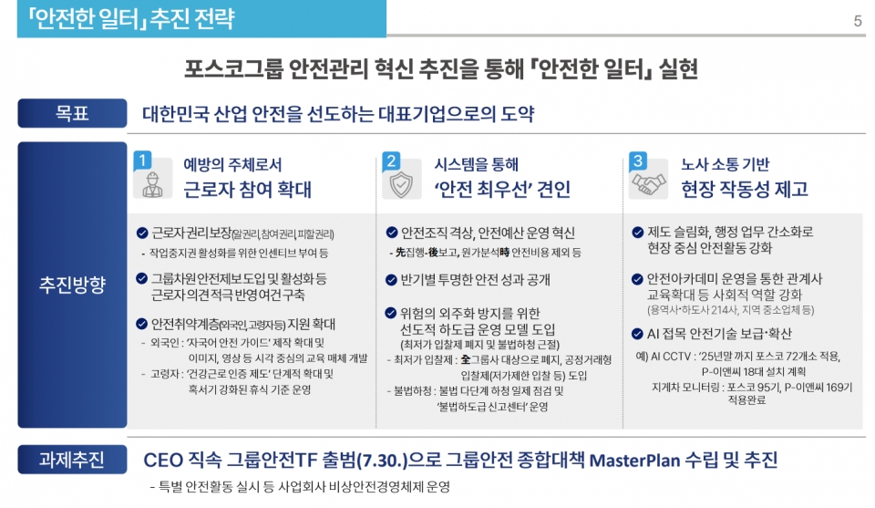 이 같은 추진 방향을 관리 하기 위해 그룹은 지난 7월, CEO 직속 그룹 안전 TF(테스크포스)를 출범시키며 그룹 종합 대책 마스터플랜(Master Plan)을 수립하고 있다. 아울러 전 사업장 안전진단을 실시하여 1,957건의 개선 기회를 발굴했으며, SGS 및 DSS 등 외부 전문기관과의 협력을 통해 객관적인 진단을 강화했으며 총 13건의 핵심 과제를 바탕으로 그룹 재해 예방 종합대책을 수립하고, '안전 플랫폼 구축' 및 'AI 안전기술' 확산에 집중하고 있다. 여기에 지난 9월에는 사회적 책임 강화를 위해 안전 전문 회사인 '포스코세이프티솔루션'을 출범하여 직영 및 관계사, 소기업에 안전 솔루션을 제공하고, 재단 설립을 통해 신속 가족 돌봄 등을 추진할 예정이다.