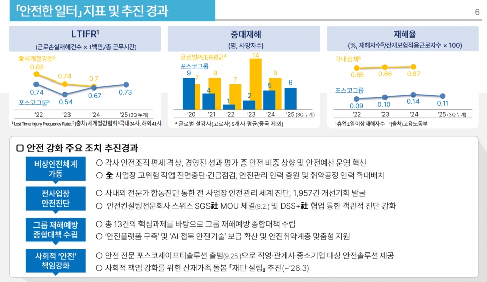 한편, 포스코홀딩스는 그룹의 3분기 누적 LTIFR (근로손실 재해율)이 0.73으로 세계철강업 평균 0.67 수준에서 관리되고 있음을 시사했다. 아울러 재해율은 0.11%로 국내 전체 평균 0.67%과 차이가 있다고 설명했다. 다만 올해 중대재해자가 6명인 점을 감안해 안전한 일터 조성에 더욱 만전을 기하겠다고 설명했다.