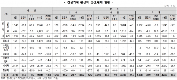 휴가시즌 및 계절적 비수기로 8월 건설기계 생산과 수출이 감소세로 돌아선 데다 주요 수출시장인 북미와 아시아, 대양주의 건설 및 광산업 경기 부진, 아파트 및 상가 미분양에 따른 국내 주택시장 장기 침체와 SOC 투자 감소 등으로 인해 건설기계 생산 및 판매가 글로벌 금융위기 이후 최저 수준에 머무르고 있다.