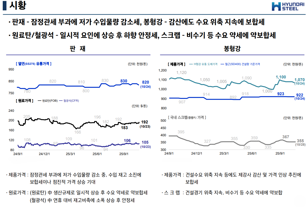 현대제철의 주요 품목인 판재류(열연/냉연)와 봉형강(철근/형강)은 잠정 관세 부과, 저가 수입 감소, 수요 위축 등 복합적인 요인에 의해 보합세(강보합 또는 약보합)가 확인되고 있다.