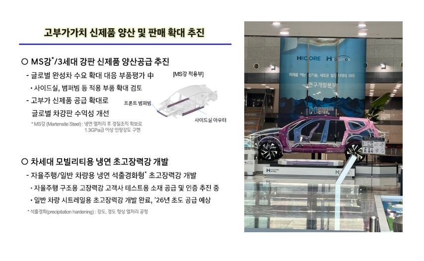 현대제철은 마르텐사이트강(MS강) 등 기존 1.3GPa급 초고장력강 공급을 확대하고, 사이드실·범퍼빔 등 고부가 부품군 중심으로 적용 부품을 넓히고 있다. 고강도 신제품 판매 확대를 통해 글로벌 완성차향 판재류 수익성을 강화한다는 계획이다.
