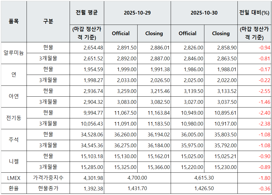 [표] LME 비철금속 및 환율 동향(10월 30일)