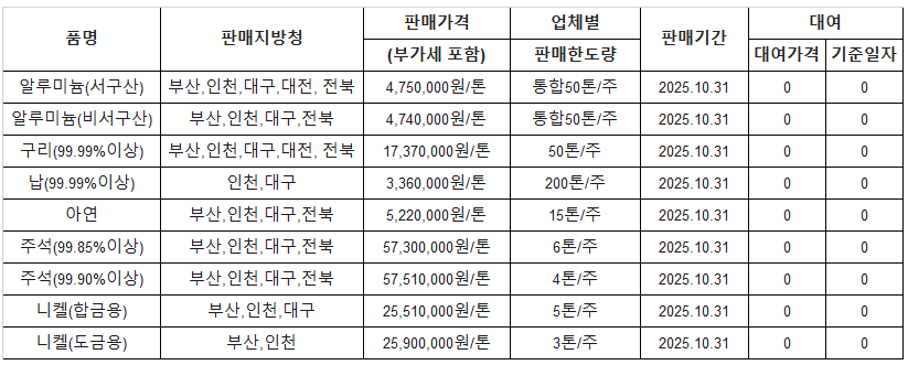 - ■ [표] 조달청 방출 가격(10월 29일)                                                                - ■ [표] LME 비철금속 및 환율 동향(10월 28일)