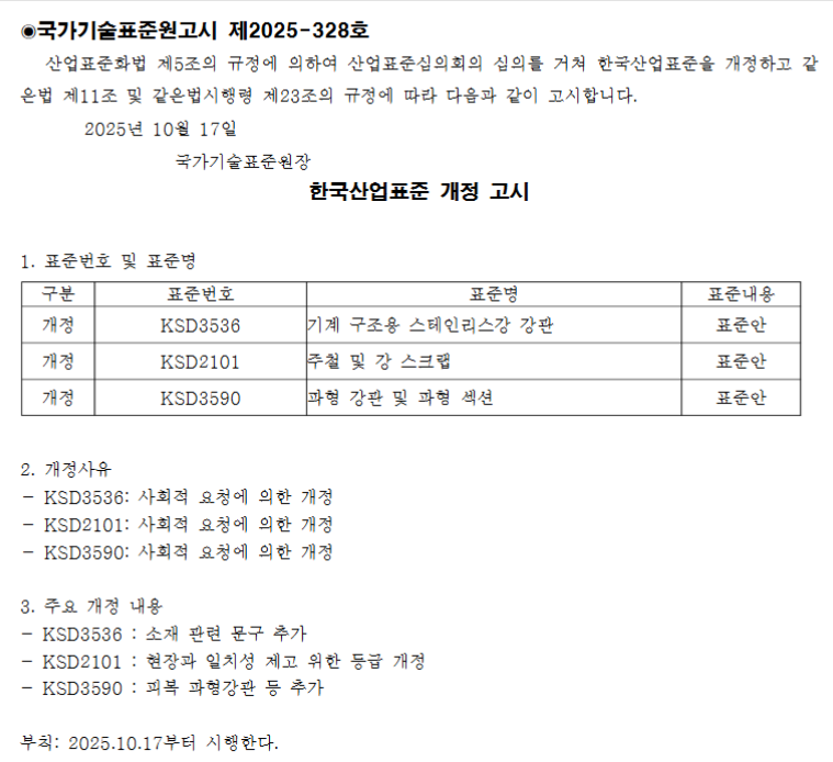 국가기술표준원이 기계구조용 스테인리스강 강관(KS D 3536) 표준과 주철 및 강스크랩(KS D 2101), 파형 강관 및 파형 섹션(KS D 3590) 표준 등 3개 한국산업표준(KS)을 개정했다고 밝혔다.