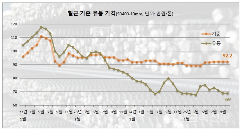 철근 기준가격은 7개월 연속 90만원대를 유지하고 있으나 유통시세는 가을철 성수기에도 70만원 선을 크게 밑돌면서 시장에 미칠 영향은 제한적일 전망이다.