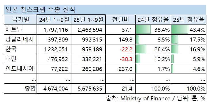 누적 수출(1~9월) 역시 베트남향이 246만4,000톤으로 전년 동기 대비 37.1% 늘었으며, 특히 방글라데시향은 149.8% 급증한 99만2,000톤을 기록했다. 반면 같은 기간 한국향 수출은 95만8,000톤으로 22.2% 감소한 것으로 집계됐다.