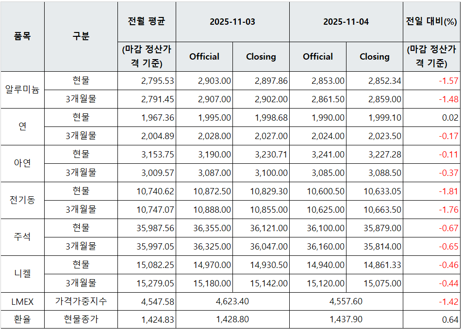 [표] LME 비철금속 및 환율 동향(11월 4일)