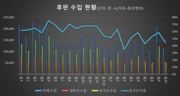 10월 중후판 수입 11만톤…전월 대비 45% 급감