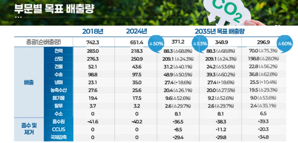 이에 따라 1안 하한선인 ‘50%’에서는 2035년 순배출량이 3억 7,120만 톤을 달성해야, 2안 하한선인 ‘52%’에서는 2035년 순배출량이 3억 4,890만 톤을 달성해야, 1~2안의 상한선인 ‘60%’에서는 2035 순배출량 2억 9.690만 톤을 달성해야 한다.