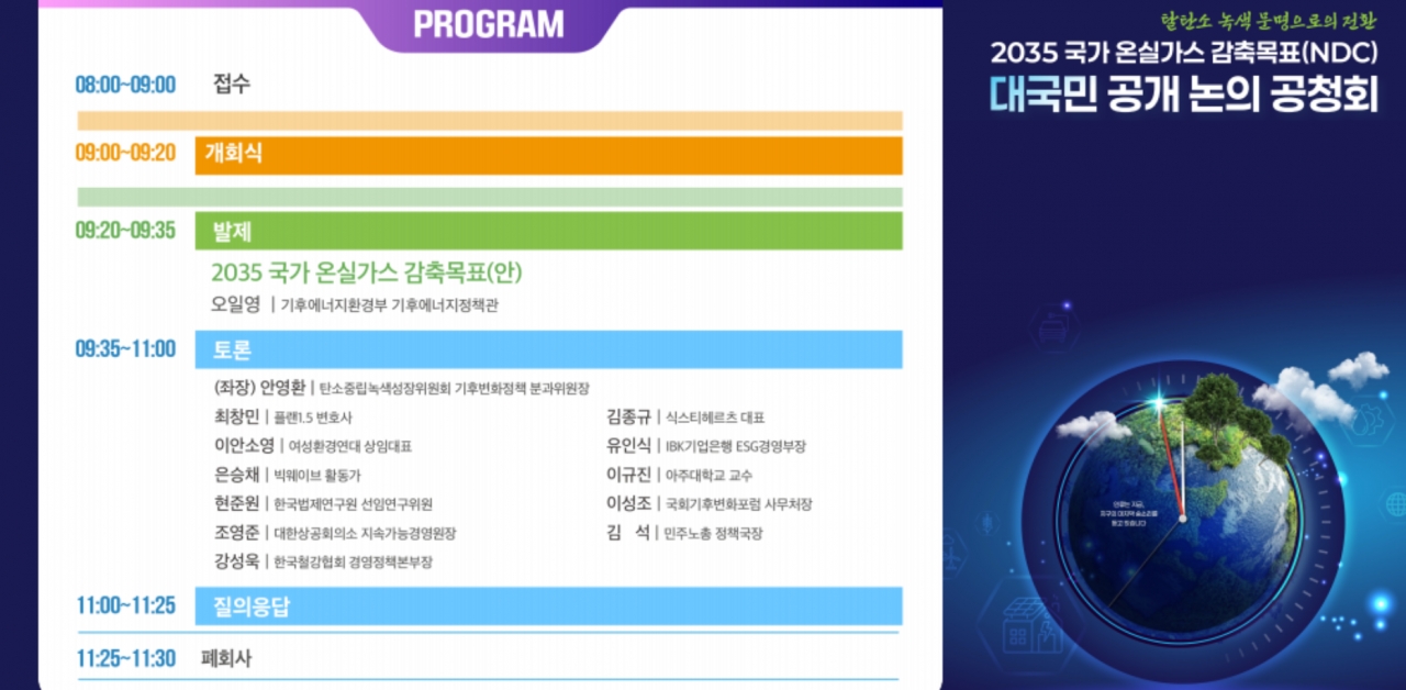 이날 토론 발제 강연으로는 기후부 오일영 기후에너지정책관은 ‘2035 국가 온실가스 감축목표(안)’을 주제로 정부의 계획과 현재까지의 NDC 논의 내용을 설명했다.