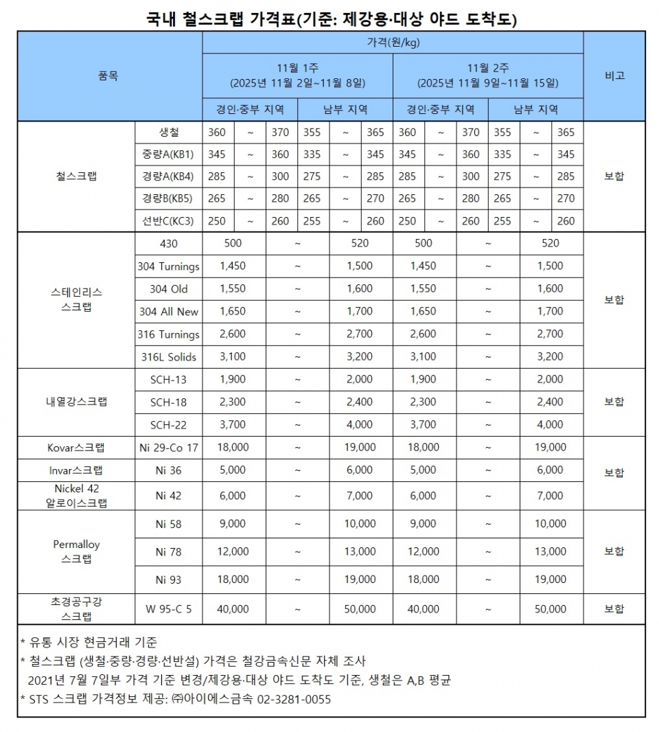 11월 둘째 주 경인·중부권과 남부권 철스크랩 가격은 모두 전주 대비 변동 없이 보합을 유지했다. 월초부터 2주 연속 보합세다.