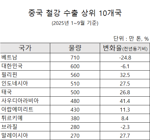 반면, 중국산 철강에 올해 반덤핑 조치를 강화한 1, 2위 시장 베트남과 한국으로의 수출은 지난해 같은 기간과 비교해 각각 24.8%, 6.1% 줄었다. 베트남은 올해 3월초부터 중국산 열연강판 수입 시 반덤핑 관세를 부과하고 있고, 7월초부터 최대 27.83%의 확정 반덤핑 관세율을 적용하고 있다.