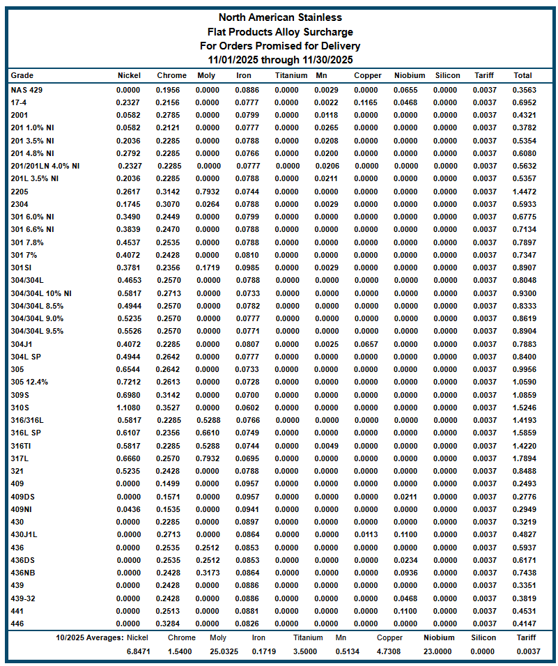 북미 스테인리스(STS) 주요 밀들이 11월 할증료를 대체로 동결 또는 인하하는 흐름을 보였다. 전월 몰리브데넘계 가격 급등 전략에서 한발 물러선 분위기다.