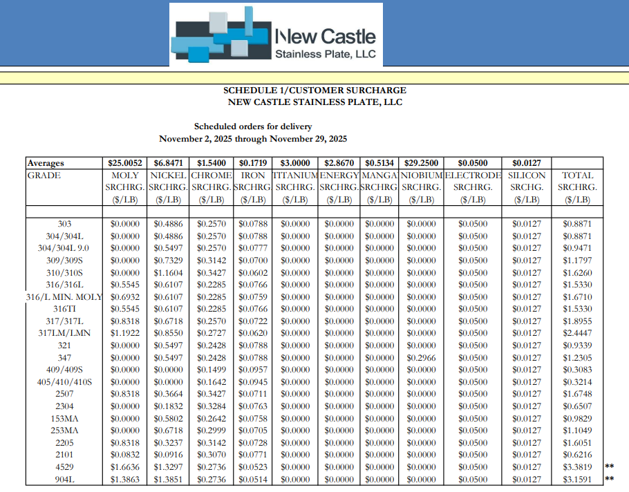 또다른 미국 주요 STS밀인 뉴캐슬 스테인리스플레이트(New Castle Stainless Plate LLC/과거 오토쿰푸 소속사업장)는 11월 STS304 할증료를 파운드당 0.8871달러로 전월 보다 0.07% 상승하며 사실상 동결했다.