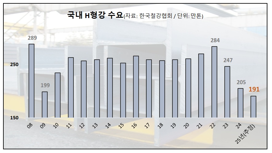 월평균 수요는 15만9,000톤 수준이며 이를 연간 물량으로 집계한 올해 총수요는 191만톤으로 추산된다. H형강 연간 수요가 200만톤 선을 밑도는 건 글로벌 금융위기 여파로 급감했던 2009년(199만톤) 이후 처음이다.